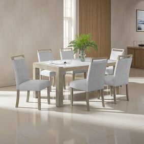 Elevate your dining experience with the 7 Piece Dining Set, featuring a stunning faux marble table top and six upholstered chairs. The spacious rectangular table showcases a luxurious, easy-care MDF faux marble surface supported by a sturdy rustic brown base with elegantly curved legs. Each chair is thoughtfully designed with a cushioned seat and back, upholstered in soft bone-colored fabric for maximum comfort and style. Perfect for family meals or entertaining guests, this set brings a sophisticated yet inviting look to any dining room. Built with durable materials and