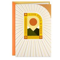 Share wishes for peace, joy and happiness—and a little gift, too—with this Hallmark birthday card that includes a removable "Live Full & Free" decal sticker with a sunset mountain scene.