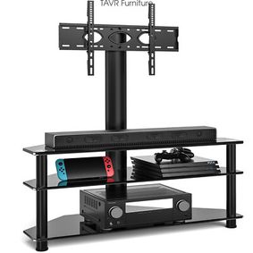 One of our top-rated glass tv stands is the 39 in. Black Glass TV Stand Fits TVs Up to 55 in. with Open Storage.