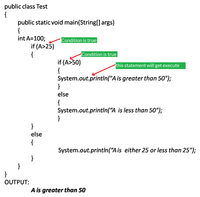The below diagram demonstrates the flow chart of an "nested-if Statement execution flow" in programming. ... The if-else-if ladder allows multiple independent conditions to be checked in order. As soon as one condition is true, its block executes, and the rest are skipped. ... import java.util.*; class Geeks { public static void main(String args[]) { int i = 20; if (i == 10) System.out.println("i is 10"); else if (i == 15) System.out.println("i is 15"); else if (i == 20) System.out.println("i is 20"); else System.out.println("i is not present"); } }