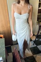 This floral print midi dress is made in slim fit with a bustier bodice and a wrap skirt with ruched sides. Perfect for special occasions, wear yours with heels and your favourite earrings.DETAILSFloral lined chiffon. Wrap design. Tie shoulder straps. Front slit. Smocked back with zipper.FIT & SIZING
