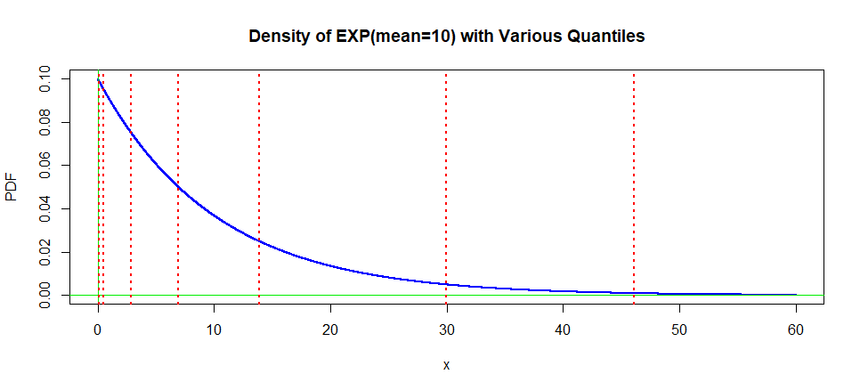 Note: All of the above is about quantiles for a normal distribution because your question deals only with normal distributions. But @Nick Cox makes a good point that quantiles are used similarly for other distributions. For example, here is a plot of an exponential distribution that has rate $\lambda = 0.1$ (hence mean $\mu = 10),$ with vertical lines at the same quantiles used above for the normal distribution.
