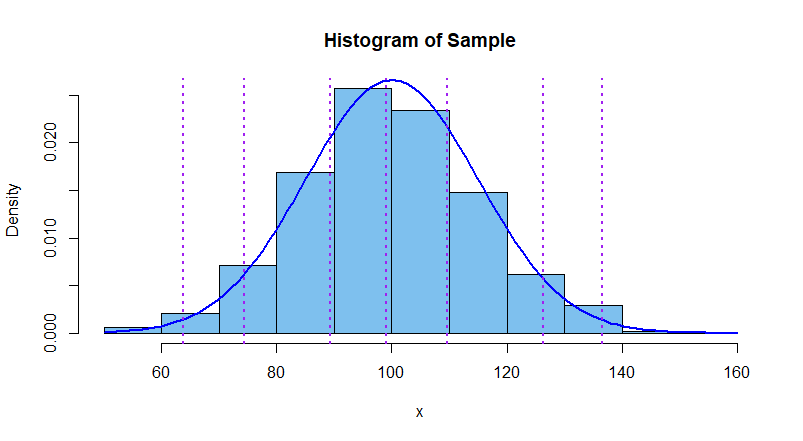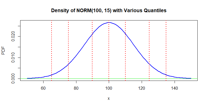 These quantiles (at vertical lines) can be displayed along with the density function of $\mathsf{Norm}(100, 15)$ as shown in the graph below.