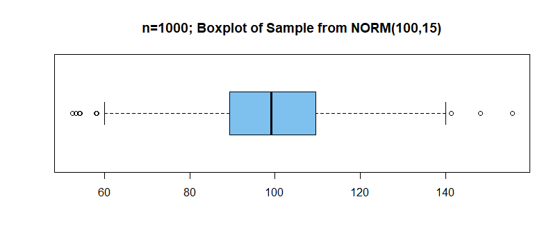 main="n=1000; Boxplot of Sample from NORM(100,15)")