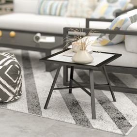 A space-saving square end table featuring a tempered glass top and sturdy metal frame for indoor or outdoor use. ... A portable grey wicker side table with a rustproof metal frame, perfect for outdoor use.