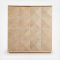 The faceted doors of this entryway cabinet feature a grid of pyramids, creating a three-dimensional facade of beautiful wood with a natural finish that showcases the grain. Behind the doors are two adjustable shelves and built-in cord cutouts. The unit is constructed of acacia veneer, oak veneer, solid oak and engineered wood.