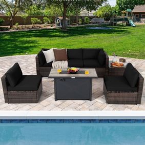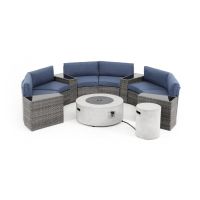 A stylish brown outdoor sofa set with all-weather wicker, UV-resistant cushions, and a stone-top fire pit. ... A stylish navy blue outdoor furniture set featuring a 32" propane fire pit table with 50,000 BTU output.