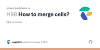 January 3, 2019 - phsym / prettytable-rs Public Β· Notifications Β· You must be signed in to change notification settings Β· Fork 76 Β· Star 1k Β· New issueCopy link Β· New issueCopy link Β· Closed Β· Closed Β· How to merge cells?#98 Β· Copy link Β· Assignees Β· Labels Β· question Β·