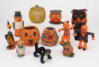 I bought these at a gift shop ~10 years ago and they are my favorite Halloween decoration to put out each year. I often stare at this set and wonder if they were mass produced or handmade. I have no idea where to post this question, so I am starting here hoping you guys can help identify the material, construction technique, etc.