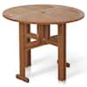 It's made from weather-resistant solid eucalyptus wood with a natural brown stain. This round slatted table is just right for entertaining on the patio: Fold it out to seat four or fold one side down to create a serving table.
