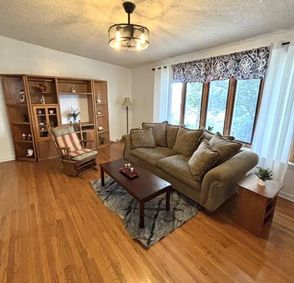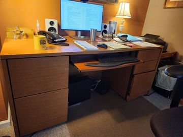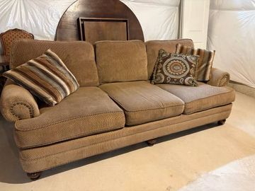 All wood bedroom set, includes two end tables, armoire, dresser, also kitchen table, wall unit, roll top desk . living room sofa, end tables, etc. All good to excellent condition.