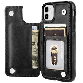 A multifunctional leather flip case for iPhone 13 with card slots, cash pocket, and kickstand feature.
