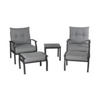 The Callaway five-piece seating set is a great addition to any front porch or backyard patio. The set includes two cushioned deep seating chairs, two cushioned ottomans that can be used to get your feet up or as extra seating, and a slat top side table. The cushions are made from a beautiful dark gray olefin fabric which is designed to be weather and fade resistant. A thick foam and polyester fill combination makes the cushions on both the chairs and ottomans extra comfortable. The steel, break-resistant slat top side table is large enough for snacks and drinks. The frame is made from a heavy-
