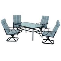 The Mountain Creek five-piece dining set includes a dining table and four high back swivel rocker dining chairs. These pieces are made with sturdy steel frames that are coated for rust protection. The dining table also features a smoked glass tabletop. The chairs are accented with outdoor-rated, weather-resistant, and UV-protected olefin fabric for comfort and style.