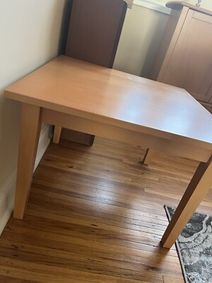 June 22, 2022 - Tam found this wooden IKEA table on Facebook Marketplace and parked it right outside her kitchen door. At first glance, the table may not look like much, but it’s actually a super-functional solution for a small space. First, Tam has dropped the leaf and gateleg on one side of the table so she can push it right up against the wall, meaning she’s not wasting a single inch of space when all she needs is a surface large enough for her and her roommate to dine.
