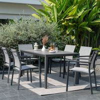 Santino 7-piece Outdoor Patio Dining Set, Includes One Dining Table and Six Armchairs, Powder Coated Aluminum Frames, Includes Umbrella Hole in the Center of the Table, Cushions Are Made with Sunbrella® Fabric That is Resistant to Stains, Mildew, Chlorine and Fading,
