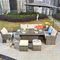 The Isla 7-Piece Propane Fire Pit Dining Table Set will make your backyard a cozy and stylish retreat! This high-quality gas fire pit patio dining set is crafted from sturdy powder-coated aluminum and synthetic rattan wicker to last for many seasons. Transform your fire pit table into a full dining table with the included burner lid. The push-button ignition system provides convenient control, allowing you to ignite the fire in seconds. Let the inviting atmosphere of this outdoor conversation set captivate your guests.