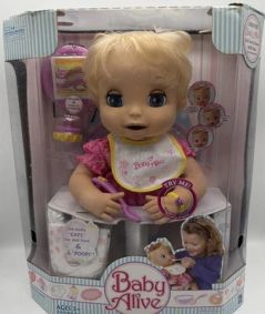 Beloved for over 40 years, Baby Alive is a lifelike doll made by Hasbro which can “eat,” “drink,” “wet,” “poop,” talk, and make a variety of sounds. The doll also has a variety of different movements and will move her mouth when ...