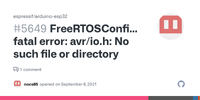 November 22, 2023 - I'm encountering an issue while attempting to compile my ESP32 project in PlatformIO. The compilation fails due to an error involving the inclusion of 'avr/io.h', which is specific to AVR microcontrollers and is not compatible with ESP32 architecture. Error Details: 'avr/io.h' file not found In file included from .pio/libdeps/nodemcu-32s/FreeRTOS/src/FreeRTOSConfig.h:32:10: .pio/libdeps/nodemcu-32s/FreeRTOS/src/FreeRTOSConfig.h:32:10: fatal error: avr/io.h: No such file or directory #include