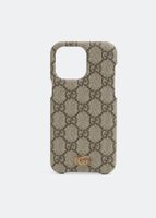 Beige and brown iPhone 14 Pro Max case from Gucci. Crafted from 'GG Supreme', this item showcases an enamelled logo application.