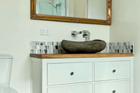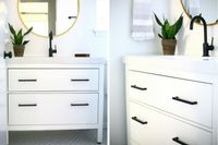 One of my favorite successes of our "two bathrooms in four days" reno projects was the affordable, cute, clean and modern bathroom vanity we created out of an IKEA sink cabinet! Here's a bit of a tutorial for you! IKEA Hemnes 2-drawer sink cabinet in 31.5" or 40.5" (this will not work as well with other models, since the pre-drilled holes will be centered on the drawers--you would have to use a cup-style pull covering the hole)