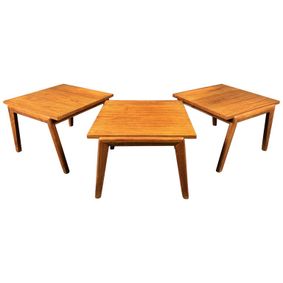 Mid-century modern teak coffee table with matching end tables Coffee table dimensions: 29.5”x59.5”x20” End table dimensions: 22”x22”x20” ... Add a touch of vintage charm to your living space with this fantastic MCM macrame end table, complete with a heavy glass top.