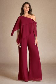 Explore the full range of options available at David's Bridal including one-piece jumpsuits and two- and three-piece pantsuit sets. Anything but basic, our mother of the bride pantsuits come in designs with jackets, three-quarter-length sleeves, short sleeves, capelets, and more.