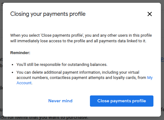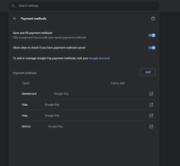 Going to "more payment settings" doesn't get me anywhere, it only to gets me to G Pay which asks me to add another payment method, but there is no removal option.