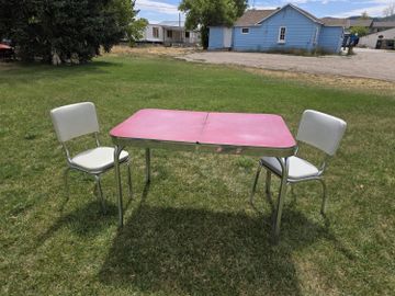 It features a 36"W x 60"L solid table top with a double tubular chrome edge and hairpin legs. The 4 chrome vintage chairs also... ... Our Norma Jean 1950's Retro Half Circle Table Set is ideal for small spaces. It features a half circle wall hugger retro table along with 2 handle back chrome chairs perfect for seating 2 people.