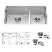 Features: Sound deadening pad Anti-condensation coating X-shaped bottom grooves Nano Coating anti-scratch Function: Stain Resistant Rust Resistant Fade-Proof Heat Resistant Material: 304 stainless steel Finishing: PVD + Nano Coating Usage scenario: kitchen/Farmhouse/Home Garden/Laundry room Dimension: Overall size: 33" (wide) × 18"(front-to-back) × 10" (bowl-depth) Drain diameter: 114mm Material thickness: 1.35mm ( 16G ) With Sound deafening pad and anti-condensation coating Packing List: 1 * 33"double bowl kitchen sink, 2 * Drainer, 2 * Bottom Grid Installation type: undermouted or drop-in