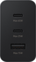 Overview The Samsung EP-T6530NBEGUS is a power adapter designed to charge multiple devices efficiently and quickly. It delivers a total output of 65 watts through three ports—two USB-C and one USB-A—allowing you to power up to three devices at the same time. This adapter supports Samsung’s Super Fast Charging technology, ensuring compatible devices receive a reliable and speedy charge. Its compact and portable design makes it easy to carry for travel, work, or home use, fitting neatly into bags or on desks without taking up much space. Key features Supports simultaneous charging of three devi