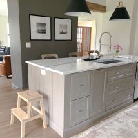 September 27, 2023 - In order to get the cabinets to the necessary height, a platform was built from 2 x 4’s (actual dimensions being 1.5″ x 3.5″) with 1″ plywood on top to create a necessary “toe kick” height of 4.5″. I wanted the island to feel like piece of furniture, rather than have a recessed toe kick. To achieve this we built the platform at a depth (front of cabinet to back of cabinet) that allowed us to install our baseboards so they would sit flush with the cabinet doors. Did this help shed some light on the process for turning Ikea cabinets into a custom kitchen island?