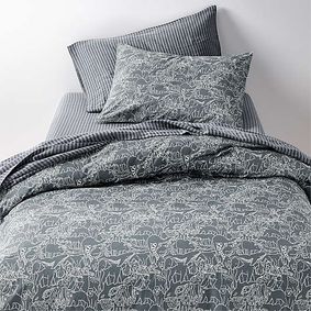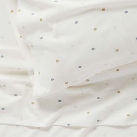 Consider whether your child tends to sleep cool or hot, and remember that a child’s skin is more sensitive. Breathable, soft, organic cotton kids bedding is a great go-to, with plenty of fabric options. Percale kids' bedding is nice and cool, as well as the more relaxed washed cotton kids' bedding. For something warm and cozy, try supersoft cotton gauze kids' bedding or stretchy jersey cotton kids' bedding.