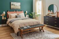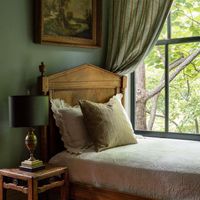 July 15, 2025 - This NYC bedroom from interior designer Alvin Wayne includes an emerald green channel tufted velvet headboard, leafy large-scale patterned wallpaper that creates a soothing base note. Earth toned accents in shades of golden mustard and brown and warm wood tones complement the nature-inspired palette. ... Pair dark green walls with plenty of soft textures to keep the bedroom feeling cozy and inviting.