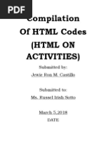 Compilation Of HTML CODES - Free download as Word Doc (.doc / .docx), PDF File (.pdf), Text File (.txt) or read online for free. The document contains examples of HTML code for various activities and exercises. It demonstrates basic HTML tags like , , , , , . It shows how to add styles with CSS for things like color, text alignment, fonts.