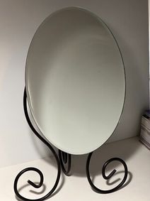 This oval vanity mirror was manufactured in 1999 by the Swiss company Ikea. It is a Myken freestanding style mirror. It features adjustable mirror angles and adjustable tripod scrolled metal legs. The very versatile minimalist style and color will enhance any decor. The adjustable frame folds flat for easy storage and travel.