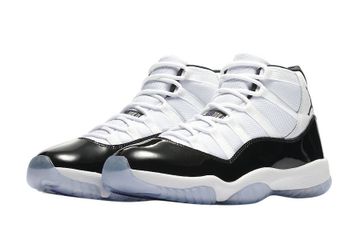 Three major color schemes; concord, white, and black, are used to tone the Air Jordan 11 Retro Low Concord. · · The ballistic mesh upper of this Low Air Jordan 11 sneaker is finished in white, and the mudguard is covered in a black patent leather material. The Phylon midsole has full-length Air unit sole for cushioning underfoot. The herringbone pattern pods on the outsole are where the titular Concord hue appears. This Retro shoe comes with a white lacing system as well. · · The Air Jordan 11 Retro Low Concord was first made available on May 3rd, 2014. It was recommended to retail at