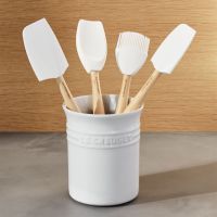 Developed with chefs and culinary enthusiasts in mind, this crisp white utensil set with coordinating crock includes five task-specific tools. Made of premium silicone heads and finely crafted wood handles engineered for the ideal grip, the utensils are corralled in an enamel-glazed stoneware crock that resists stains and scratches. Set includes small and medium spatula, basting brush and spatula spoon.Wood-handled utensils with silicone heads. Stoneware crock with enamel glaze finish. Silicone heads are dishwasher-safe. Hand wash wood handles. Clean crock with a damp cloth. Set includes small