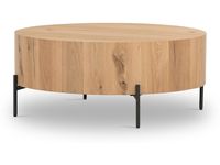 Add this round coffee table to your living room or den for a stunning and unique addition. ... You are going to fall in love with our Sunburst Oak Drum Coffee Table. This accent table features a sunburst oak top and an impressive wide black metal cuff.