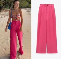 Brighten up your wardrobe with these vibrant hot pink wide-leg pants from Zara, size Medium (US 28). Made in Turkey with a soft and breathable lyocell-polyester blend (71% lyocell, 29% polyester), these trousers feature a flattering high-rise fit, functional side pockets, belt loops, and a front zipper/button closure.