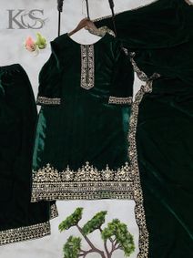 Features an emerald green Kurta paired embroidered with crimson red patch work embellished with rose gold, zari and mirror work. Teamed with matching pants and a soft net embellished dupatta Composition: Kurta and Pants -Velvet, Dupatta - Soft Net Care: Dry Clean Only and Vacuum Storage This product can be customised for sleeves, length of blouse and neckline Delivery : 4-6 weeks as the product is hand crafted.