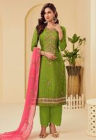 Impress everyone adoring this green kameez top in georgette material embellished with all-over thread embroidery, khatli handwork, and sequins work come with attached inner santoon material. This top is paired with similar color pants in santoon material and pink color georgette dupatta with sequins and thread embroidery work.