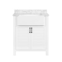 Home / Products / Bathroom / Bathroom Vanities / Vanities with Top / OVE Decors Cress 30-in White Vanity with Farmhouse Style Sink Farmhouse style white finish vanity, 30-in wide x 22-in deep x 34-in high with matte black hardware included · Beautiful white engineered stone countertop with rectangle undermount ceramic sink with overflow and 3-in removable backsplash · Features two soft-closing doors with adjustable shelf · Pre-drilled for 4-in faucet - faucet not included · Adjustable leveling feet for uneven floors · Back panel cut-out for easy plumbing · Fully assembled and easy to install ·