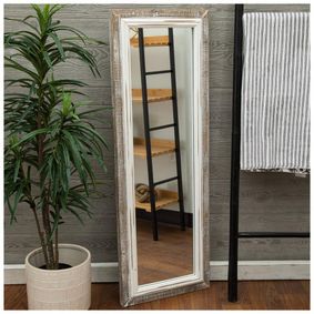 This full-length mirror is the perfect addition to any traditional-style home, instantly upgrading your decor. The rectangle frame is crafted from durable solid pine wood with a closed-corner structure, ensuring long-lasting appeal and stability. It features a neutral finish enhanced by purposeful coat and paint distressing, offering a timeless, elegant look that makes a statement in any room. This wall-mounted piece offers flexible installation, allowing for both horizontal and vertical orientation to suit your space.