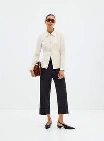 The Pierre cotton women's blazer is a frock coat style jacket that stands out for its elegance and sophisticated design. Crafted from premium cotton fabric, it features a slightly longer back with a duckbill finish and a lapel collar for added distinction. The front, designed with a double dart, highlights the female waist, creating a flattering silhouette.