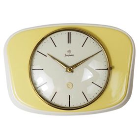 Here w... ... Funky and square ... Here a fun design from teak and golden chrome connectors... ... A lovely oval mid-century modern wall clock and timer, crafted by Junghans in Germany during the 1960s....