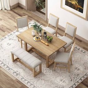 Description: This rectangular dining table seat up to 6 people comfortably. Includes 4 elegant chairs, a durable bench and a sturdy dining table. The legs of the chair and bench are made of rubber wood to ensure the service life and safety.