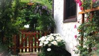 Narrow Garden Space of Townhouse This very narrow space on the side of a townhouse is made more interesting by using an interesting paving pattern with tiles and pea gravel, plus a variety of plants in pots.