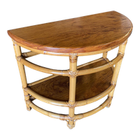 Description · Vintage 1940s two-tier rattan side table featuring stylized single-strand legs, ladder sides, and beautiful half-round mahogany tops. 1950, United States We only purchase and sell only the best and finest rattan furniture made by the best and most well-known American designers and manufacturers including: Ritts Company. (Herb Sr. and Shirley Ritts) Tropitan Seven Seas Rattan Paul Frankl Tropical Sun Rattan These designers and companies helped to popularize rattan furniture in the United States during the 1930s thru the 1960s. Shirley Ritts was the mother of the photographer and m