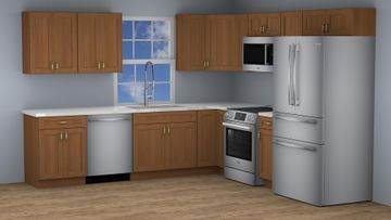 The Amish crafted Maple Unfinished Kitchen Cabinets - 10x10 L-Shaped Kitchen Design Layout list price is a standard starter kitchen setup with the basics.
